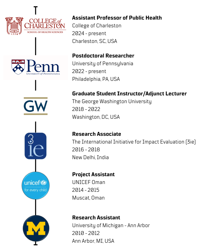 Assistant Professor of Public Health in the Department of Health and Human Performance, School of Health Sciences (2024 - present) | College of Charleston, Charleston, SC, USA.